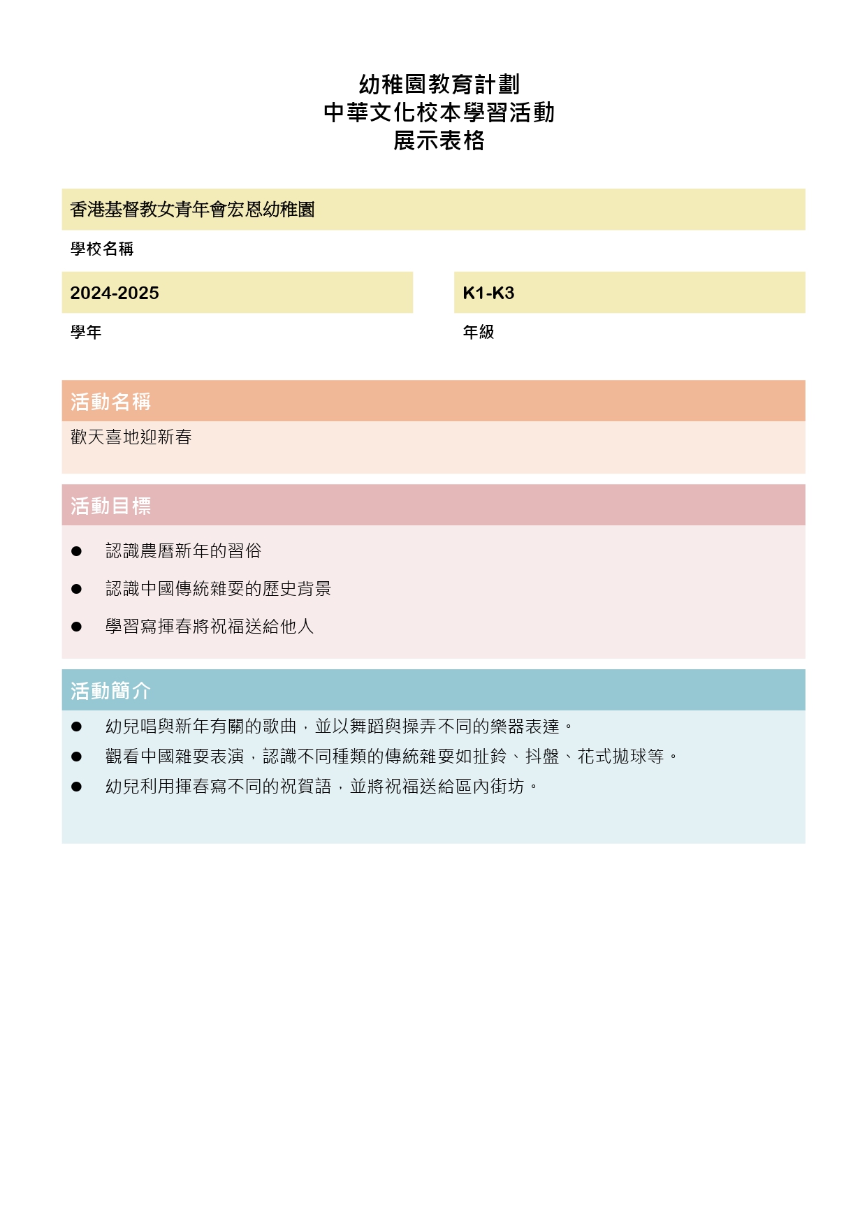 學校重視中國傳統文化,就著中華文化設計不同藝術、美食、節日活動體驗,以加深幼兒對中國及中華文化習俗的認識,從而提升幼兒的國民意識,培養幼兒禮貌、孝順父母等中國傳統美德。